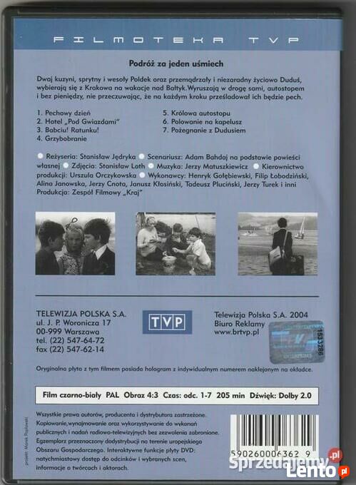Podróż za jeden uśmiech [DVD] Podróż za jeden uśmiech Kraj: Polska Rok produkcji: 1972 Reżyseria: Stanisław Jedryka Scenariusz: Adam Bahdaj Muzyka: Jerzy Matuszkiewicz Obsada: Jan Machulski, Boguslaw Sochnacki, Ryszard Pietruski, Janusz Kłosiński, Jerzy Turek, Henryk Golebiewski, Witold Skaruch, Teresa SzmigielĂłwna, Boleslaw Plotnicki, Franciszek Trzeciak, Teresa Szmigielówna, Edmund Fetting, Mieczyslaw Voit, Jerzy Braszka, Jerzy Cnota, Alina Janowska, Czeslaw Piaskowski, Henryk Bak, Marzena Trybała, ... Studio: ZF Panorama Opis Dwaj kuzyni - Duduś Fąferski i Poldek Wanatowicz - mają tuż po zakończeniu roku szkolnego wyjechać na wakacje nad morze. Ojciec Poldka, który miał ich odwieźć, w ostatniej chwili wyjeżdża służbowo do Gliwic, a konwojowanie chłopców powierza niewiele od nich starszej cioci Ani. W tym samym czasie Ani proponuje wspólny wyjazd jej ukochany - sportowiec Franek Szajba, grożąc dziewczynie w razie odmowy rozstaniem. W tej sytuacji Poldek decyduje, że pojadą z Dudusiem sami... 1.PECHOWY DZIEŃ (27 min.) Dwaj główni bohaterowie: sprytny i wesoły Poldek oraz Duduś, niezaradny życiowo i przemądrzały elegancik, wybierają się na wakacje nad Bałtyk. Wyruszają z Krakowa, nawet nie przeczuwając, że przez całą drogę na każdym kroku będzie ich prześladował potworny pech. Na początek chłopcy zapominają zabrać ze sobą z domu bilety na pociąg. 2. HOTEL POD GWIAZDAMI (30 min.) W swej wędrówce z Krakowa nad morze Leopold i Duduś dołączają do dzieci z kolonii. Małym podróżnikom grunt pali się pod nogami. Ukradkiem opuszczają kolonię i następną noc spędzają pod gołym niebem, w ''hotelu pod gwiazdami''. 3. BABCIU, RATUNKU! (28 min.) Następny etap podróży z Krakowa nad morze Poldek i Duduś przebywają ukryci w ogromnym meblowozie. Kierowca odkrywa jednak obecność pasażerów na gapę i zostawia chłopców w szczerym polu. 4. GRZYBOBRANIE (29 min.) Chłopcom udaje się zmylić milicjantów i razem z odzyskaną walizką ruszają nad jezioro. Tam korzystają z gościnności grupy młodych ludzi, którzy na dalsze wakacje zarabiają zbieraniem grzybów. Poldek i Duduś zostają włączeni do tej akcji, ale - jak się okazuje - zupełnie nie znają się na grzybach i na wielki zarobek liczyć nie mogą. Podczas wędrówki po lesie Poldek staje się świadkiem dziwnej sceny w samochodzie. Po powrocie do obozu opowiada starszym chłopcom o tym, co widział. Wszyscy nabierają przekonania, że wpadł na trop wielkiego przestępcy. Tymczasem Duduś chroni się na drzewie przed atakującym go odyńcem. Wreszcie obaj autostopowicze trafiają na komendę milicji, skąd odbiera ich niedawno poznana, tajemnicza pani. W jej towarzystwie chłopcy ruszają w dalszą podróż. 5. KRÓLOWA AUTOSTOPU (30 min.) Ciocia Ula wyróżnia się urodą. Okazuje się, że jest królową autostopu, od lat wędrującą po kraju. Spotkana grupa trampów porywa ciocię Ulę i chłopców na dalszą wędrówkę. 6. POLOWANIE NA KAPELUSZE (30 min.) Podróżujący okazją chłopcy docierają wreszcie nad Bałtyk. Są przekonani, że ciocia Ula wsiadła do szoferki samochodu-chłodni i również jest na miejscu. Okazuje się jednak, że nastąpiło fatalne nieporozumienie. Ciocia została nad jeziorem, skąd zabrał ich uprzejmy kierowca. Pechowi podróżnicy oddają bagaże do przechowalni, a następnie wyruszają na sopockie molo - najbardziej uczęszczane miejsce w okolicy. Po drodze niemal wszędzie zostawiają wiadomość dla cioci Uli, gdyby ich szukała. Siedząc w kawiarni przy molo, chłopcy są świadkami przypadkowej zamiany słomkowych kapeluszy. Okazuje się, że jeden z właścicieli ma powód do ogromnego zmartwienia. W jego kapeluszu był bowiem schowany kupon loterii, na który padła wielka wygrana - sto tysięcy złotych. Roztargniony pan usiłuje odzyskać tak cenne nakrycie głowy, a chłopcy próbują mu pomóc. Tym chętniej prowadzą poszukiwania, gdy dowiadują się, że czeka ich wysoka nagroda. Po wielu perypetiach odnajdują wreszcie zgubę. Ale najwyraźniej prześladuje ich pech. Nagroda przechodzi im koło nosa, a ciocia Ula nie daje znaku życia. 7. POŻEGNANIE Z DUDUSIEM (33 min.) - odcinek ostatni Chłopcy docierają wreszcie nad morze. To już kres ich podróży. Wędrując wzdłuż wybrzeża, przypadkowo rozłączają się. Upłynie sporo czasu, zanim znowu się odnajdą. W czasie tych wędrówek Duduś zmienił się nie do poznania. Z niezdarnego maminsynka stał się dzielnym młodzieńcem. Stan produktu Produkt ORYGINALNY. Płyta NOWA bez folii. Tytuł: Podróż za jeden uśmiech Dział: DVD Kraj wydania: Polska Czas trwania: 205 min. Dodatki: bezpośredni dostęp do scen informacje o twórcach i aktorach TVP poleca Dźwięk: Dolby Digital 2.0 polski Polska wersja: polska produkcja Obraz: 4:3 Region DVD: 2 Opakowanie: keep case Liczba nośników: [1xDVD] Karton 92 Ogłoszenie jest aktualne dopóki znajduje się na stronie . Odbiór osobisty lub wysyłkaSprawdź zainteresowanie tym ogłoszeniem