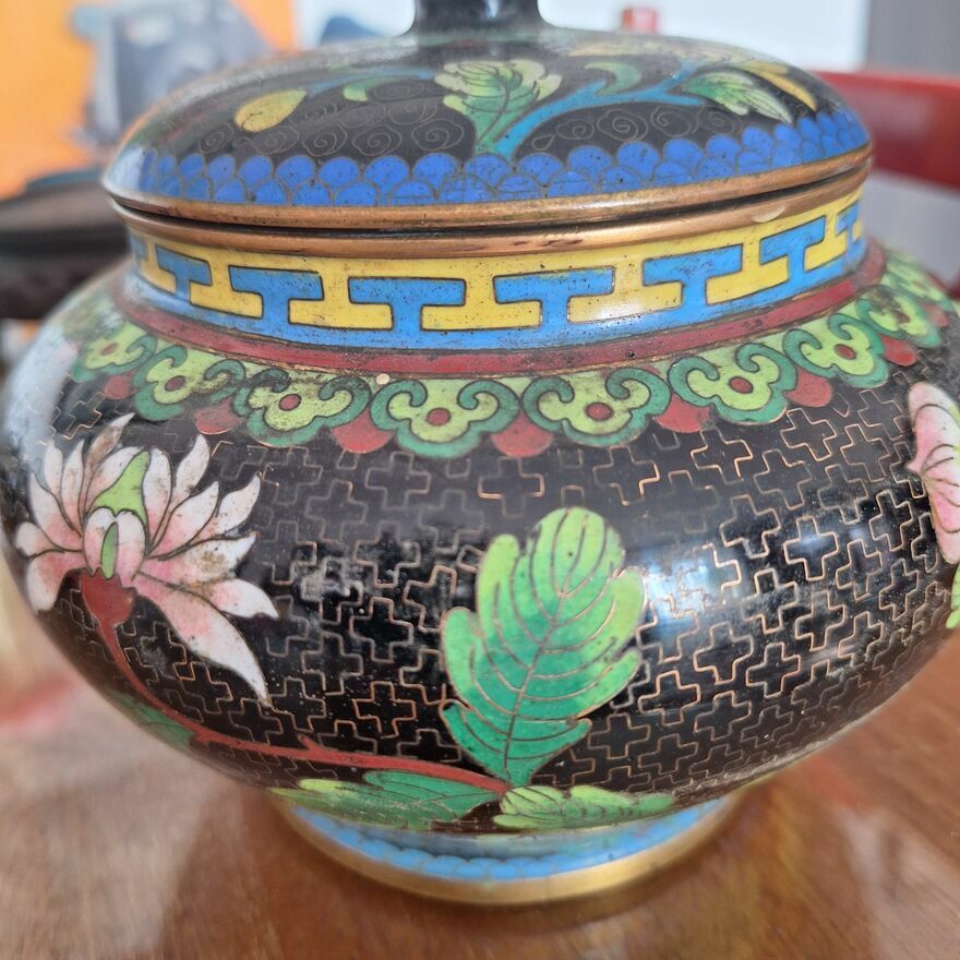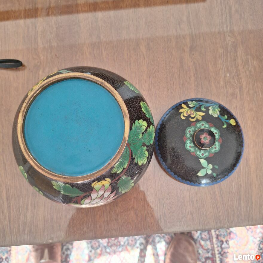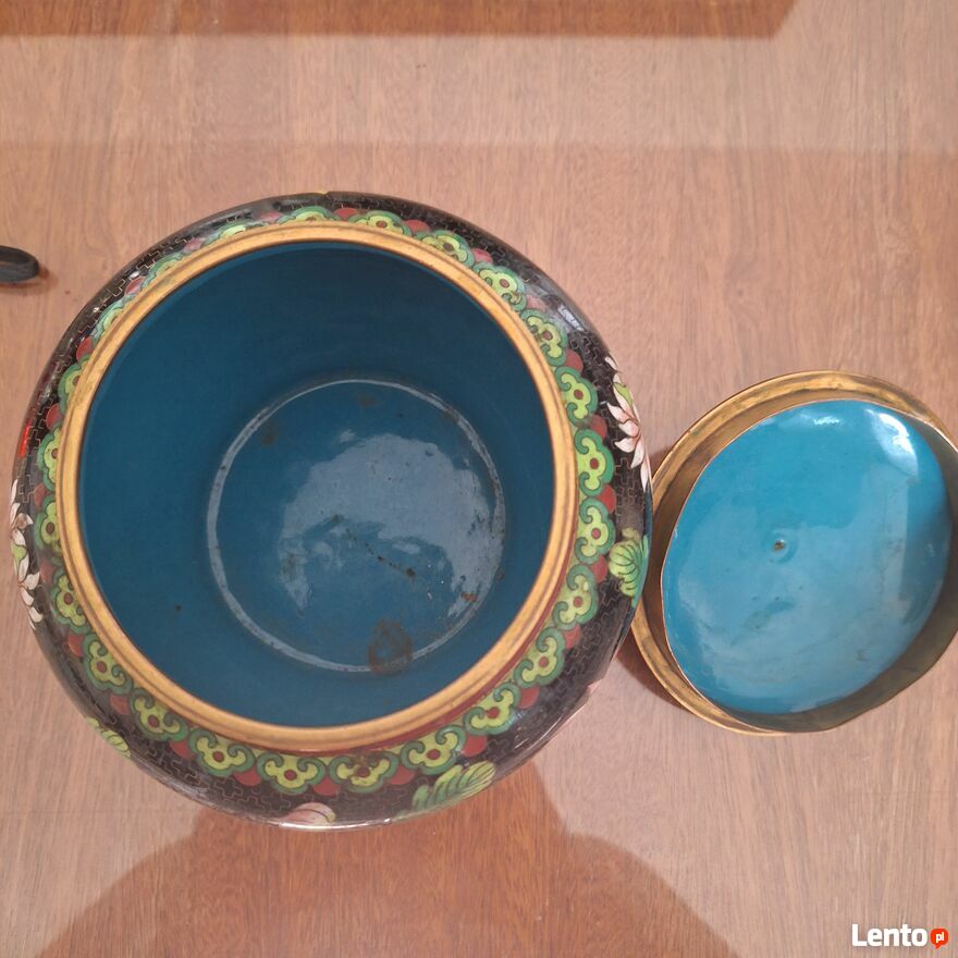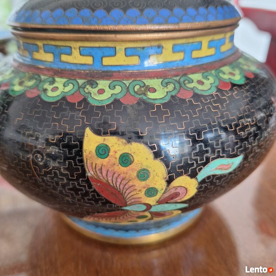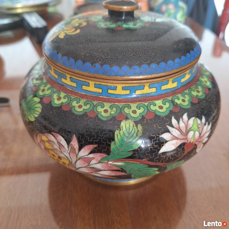 Pięknie zdobiony pojemnik z pokrywką. Pochodzenie z Chin. Szerokość 15 cm. Wysokość z pokrywką 12 cm. Stan jak na zdjęciach. Możliwość obejrzenia w Warszawie GocławSprawdź zainteresowanie tym ogłoszeniem