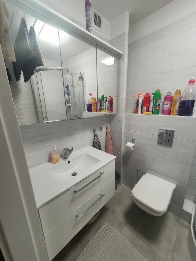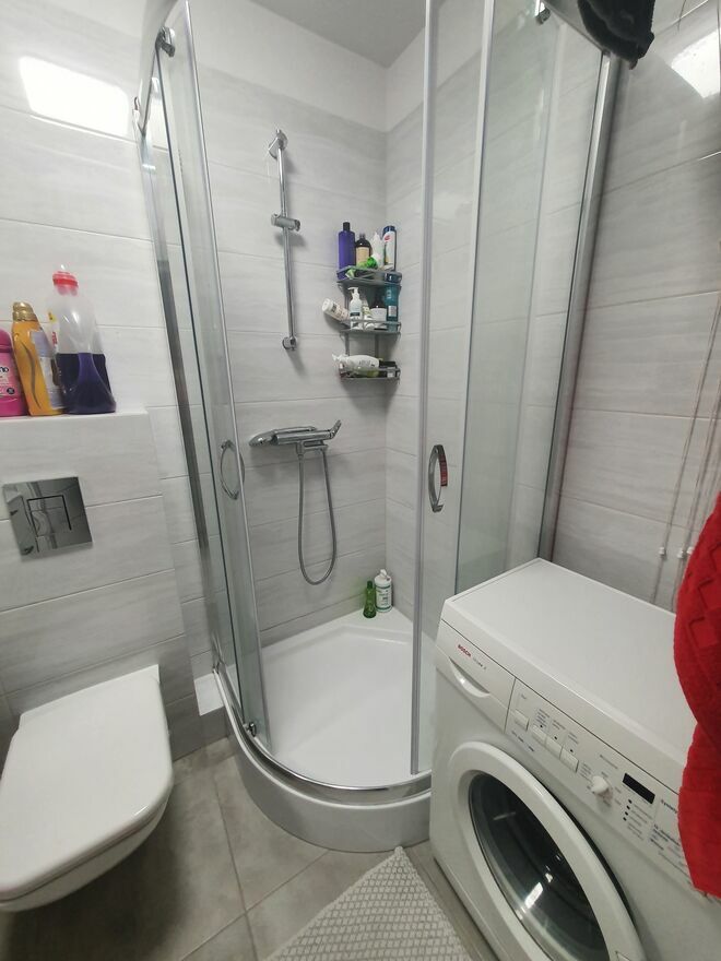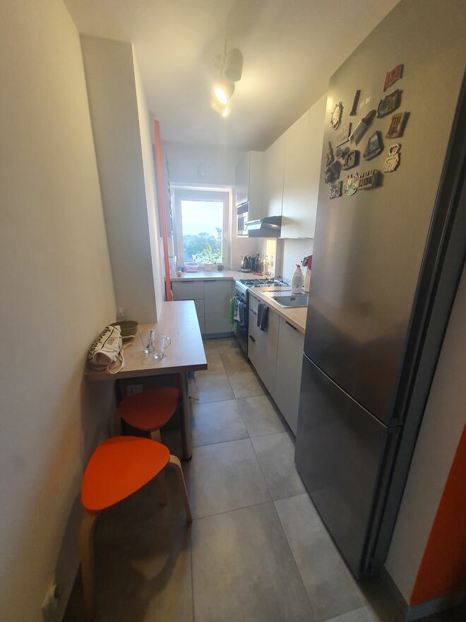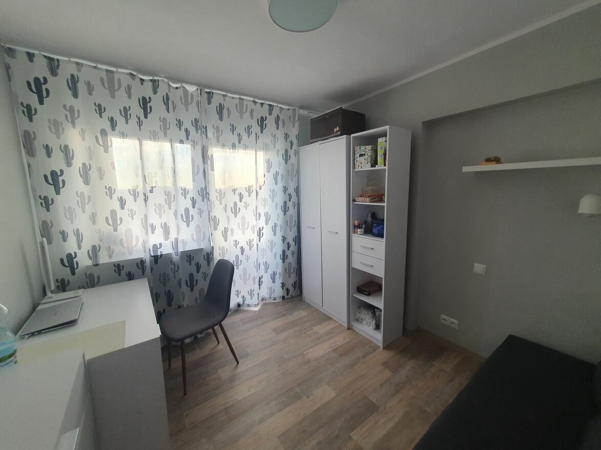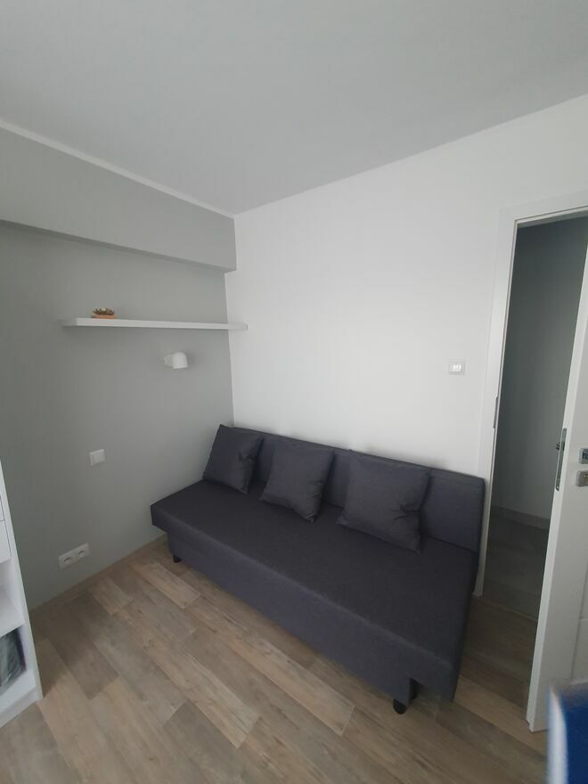 Pokój ok 10m2, w pełni umeblowany (rozkładane łóżko, biurko, krzesło, regał, szafa), zamykany na klucz. W mieszkaniu widna kuchnia, łazienka z prysznicem i pralką, osobne WC.
