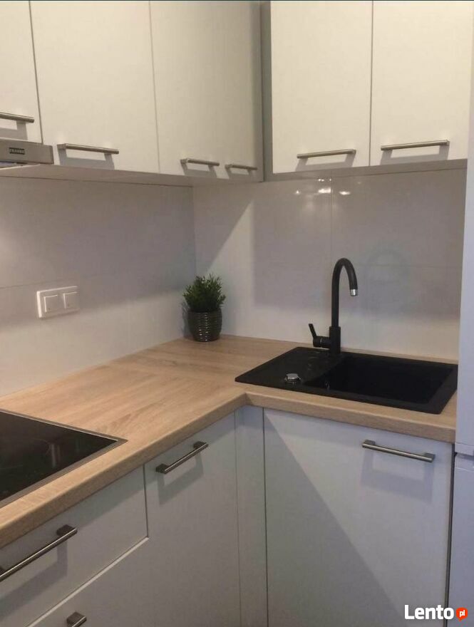 Kuchni wyposazona w plyte indukcyjna, lodowke, zlew, pojemne szafki wraz z wyposazeniem garnki/talerze/sztucce.