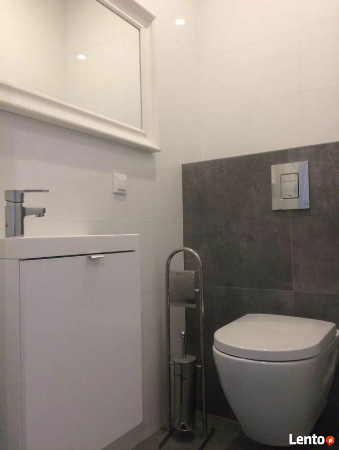 Mieszkanie posiada dwie lazienki, jedna sklada sie z toalety z umywalka, w drugiej znajduje sie pralka, prysznic liniowy, toaleta, umywalka.