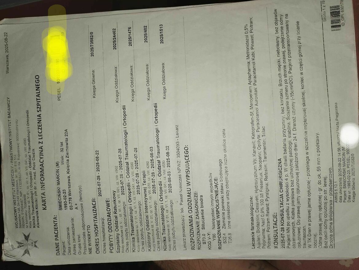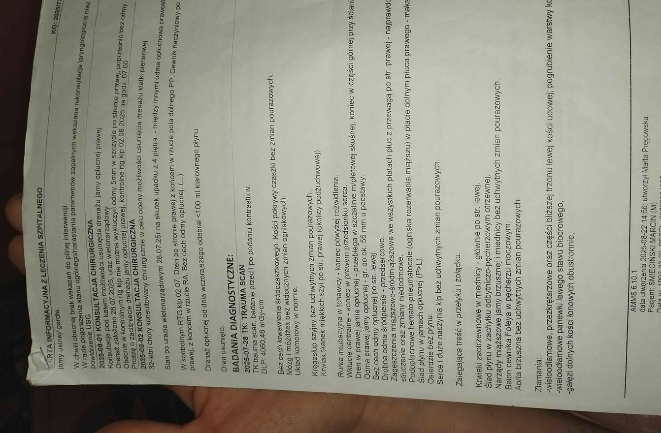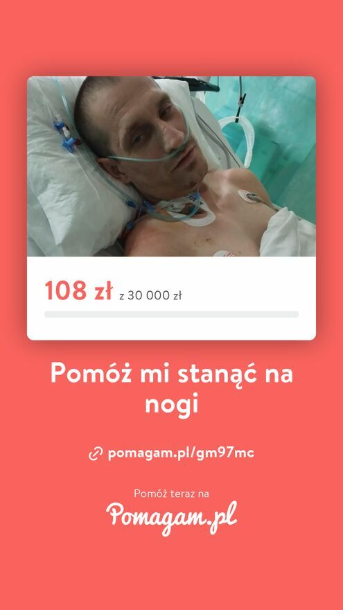 Pomoc po ciężkim wypadku – proszę o wsparcieNazywam się Marcin Śmieciński. Kilka miesięcy temu uległem bardzo poważnemu wypadkowi – spadłem z 4. piętra. Doznałem ciężkich obrażeń: zmiażdżonej miednicy, otwartego złamania uda, złamania pięty, uszkodzenia nerwu udowego oraz konieczności wszczepienia sztucznego biodra. Długo leżałem na OIOM-ie, a teraz czeka mnie długa i kosztowna rehabilitacja.