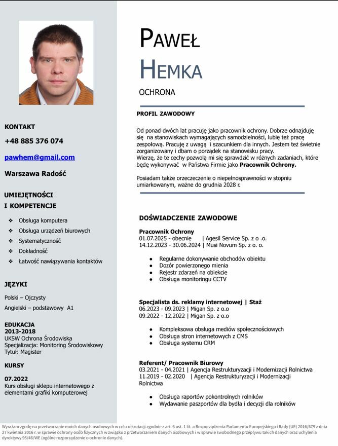 Poszukuję pracy jako cieć na terenie Warszawy od października. Posiadam stopień umiarkowany 02p.Paweł