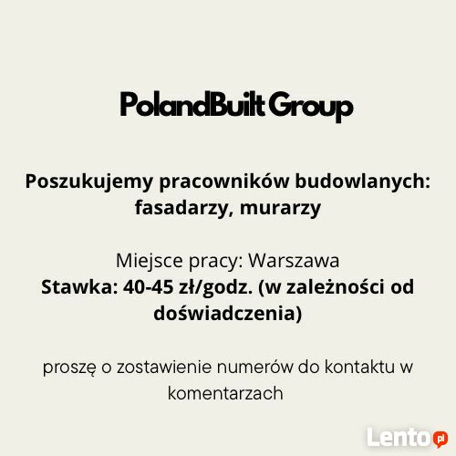 Poszukujemy pracowników budowlanych: fasadarzy, murarzyMiejsce pracy: Warszawa