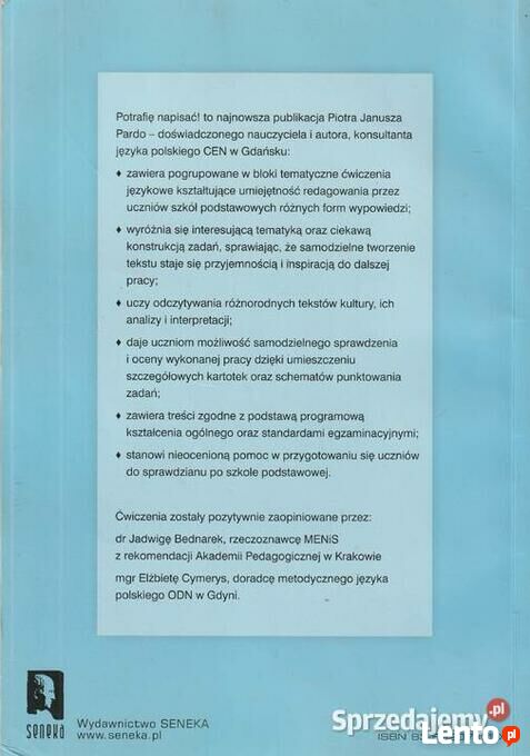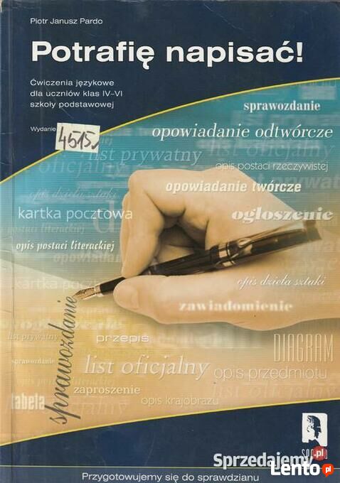 Potrafię napisać! to najnowsza publikacja Piotra Janusza Pardo - doświadczonego nauczyciela i autora, konsultanta języka polskiego CEN w Gdańsku: zawiera pogrupowane w bloki tematyczne ćwiczenia językowe kształtujące umiejętność redagowania przez uczniów szkół podstawowych różnych form wypowiedzi; wyróżnia się interesującą tematyką oraz ciekawą konstrukcją zadań, sprawiając, że samodzielne tworzenie tekstu staje się przyjemnością i inspiracją do dalszej pracy; uczy odczytywania różnorodnych tekstów kultury, ich analizy i interpretacji; daje uczniom możliwość samodzielnego sprawdzenia i oceny wykonanej pracy dzięki umieszczeniu szczegółowych kartotek oraz schematów punktowania zadań; zawiera treści zgodne z podstawą programową kształcenia ogólnego oraz standardami egzaminacyjnymi; stanowi nieocenioną pomoc w przygotowaniu się uczniów do sprawdzianu po szkole podstawowej. Ćwiczenia zostały pozytywnie zaopiniowane przez: dr Jadwigę Bednarek, rzeczoznawcę MENIS z rekomendacji Akademii Pedagogicznej w Krakowie mgr Elżbietę Cymerys, doradcę metodycznego języka polskiego ODN w Gdyni. Wydawnictwo SENEKA ISBN 83-89207-01-X Karton 90 Ogłoszenie jest aktualne dopóki znajduje się na stronie . Odbiór osobisty lub wysyłkaSprawdź zainteresowanie tym ogłoszeniem