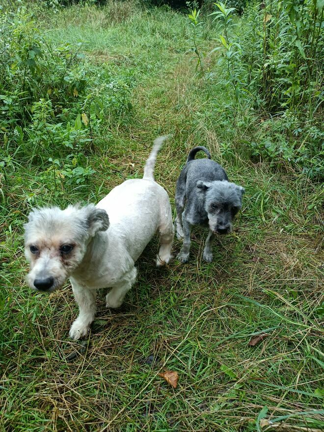 Wcześniej widywaliśmy je na działce, ale przez ostatnie miesiące nie było widać ani ich Pana ani psów. Nie było ich też słychać. Wczoraj okazało się że cały ten czas psy były ze swoim panem w domu, wychodziły bardzo sporadycznie gdy odwiedzali go koledzy od kieliszka. Posesja jest jednak tak zarośnięta że nie było ich widać. Psiaki załatwiały się przez ten czas w domu.