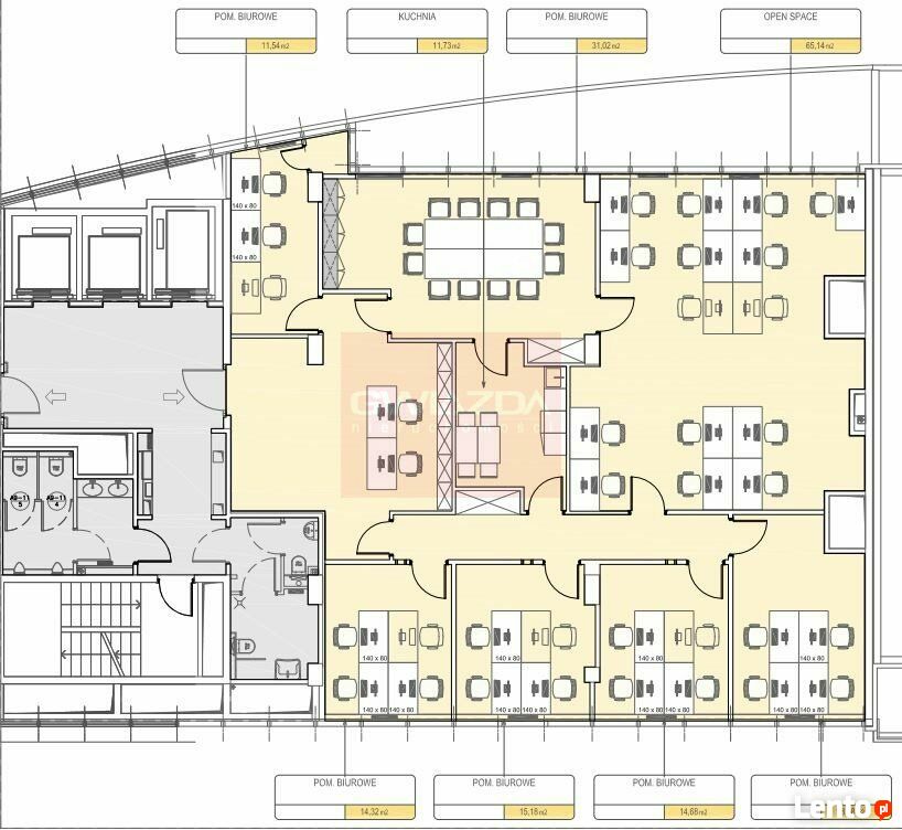 Standard powierzchni: klimatyzacja, podwieszany sufit, kontrola dostępu, okablowanie, otwierane okna, światłowód, czujniki dymu, ochrona recepcja, wykładzina, ścianki działowe.