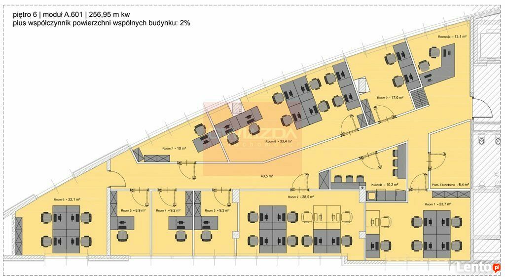 Standard powierzchni: klimatyzacja, podwieszany sufit, kontrola dostępu, okablowanie, otwierane okna, światłowód, czujniki dymu, ochrona recepcja, wykładzina, ścianki działowe.