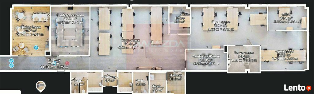 Na powierzchni gotowa serwerownia, open space, sala konferencyjna, dwa gabinety, przestronna, otwarta kuchnia oraz toalety.