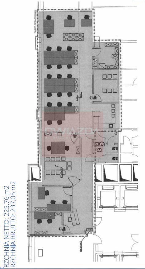 Aktualny układ biura jest widoczny na planie w ofercie. Możliwy dodatkowy podział lub otworzenie powierzchni.