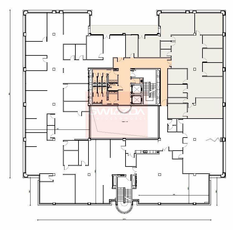 Obecny podział pomieszczeń jest widoczny na planie w tej ofercie, układ mieszany - otwarta przestrzeń oraz wydzielone przeszklone gabinety, sale konferencyjne oraz część socjalna i toalety.
