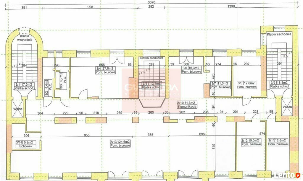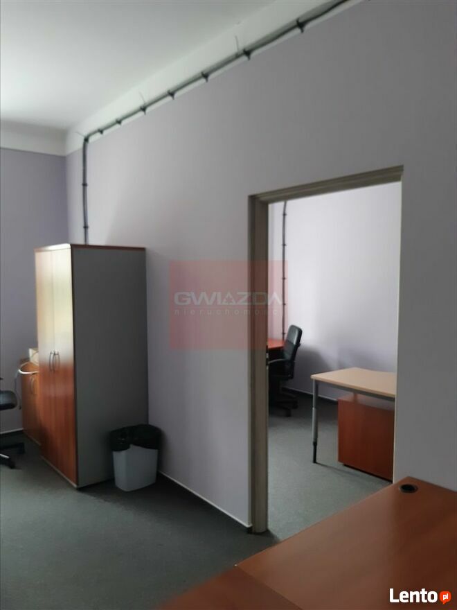 Do wynajęcia powierzchnia biurowa na piętrze drugim 299 mkw. podzielona obecnie na gabinety i pomieszczenia socjalne.
