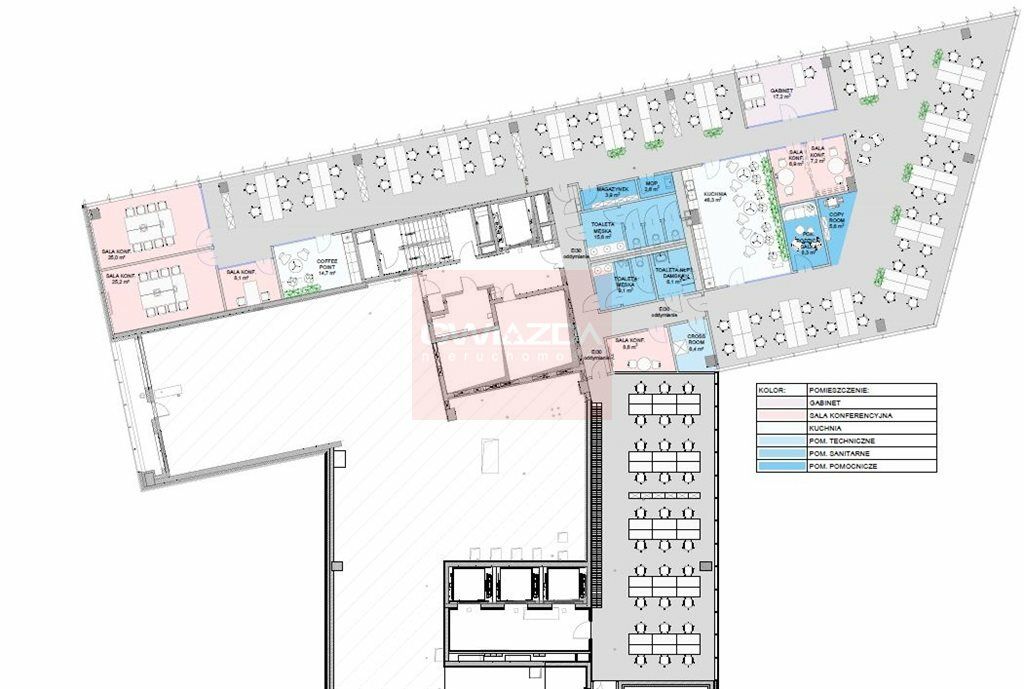 Oprócz tego na piętrze siódmym - 1390 mkw. netto. obecnie w układzie otwartym - do aranżacji dla konkretnego Najemcy.