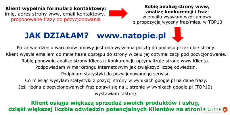 Na początku współpracy robię dokładną SEO analizę strony pod względem obecnej pozycji w wyszukiwarce, błędów technicznych, struktury serwisu, struktury informacji, analizy konkurencji. W ciągu 24h robię darmową wycenę fraz oraz pozycjonowania. Każda fraza wyceniana indywidualnie - rozliczenie za efekt lub abonament miesięczny - preferowany. Dzielę się z Klientem strategią pozycjonowania, podpisuję umowę na czas min. 7 miesięcy z 1 miesięcznym okresem wypowiedzenia bez kar za jej zerwanie.