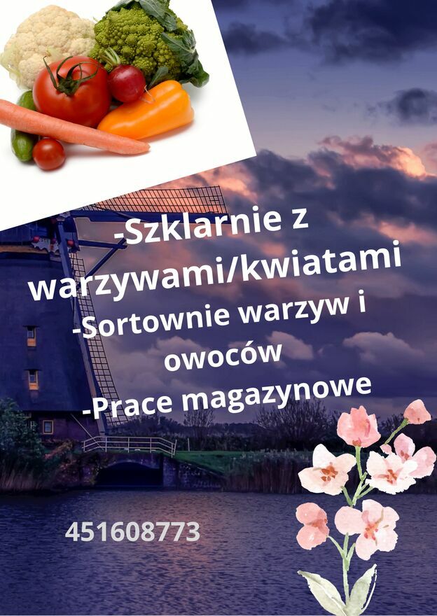 Aktualnie poszukujemy pracowników na;- szklarnie/sortownie - język nie jest wymagany, mile widziane pary/single stawka od 14.06 brutto zakwaterowanie i praca w rejonie Westland