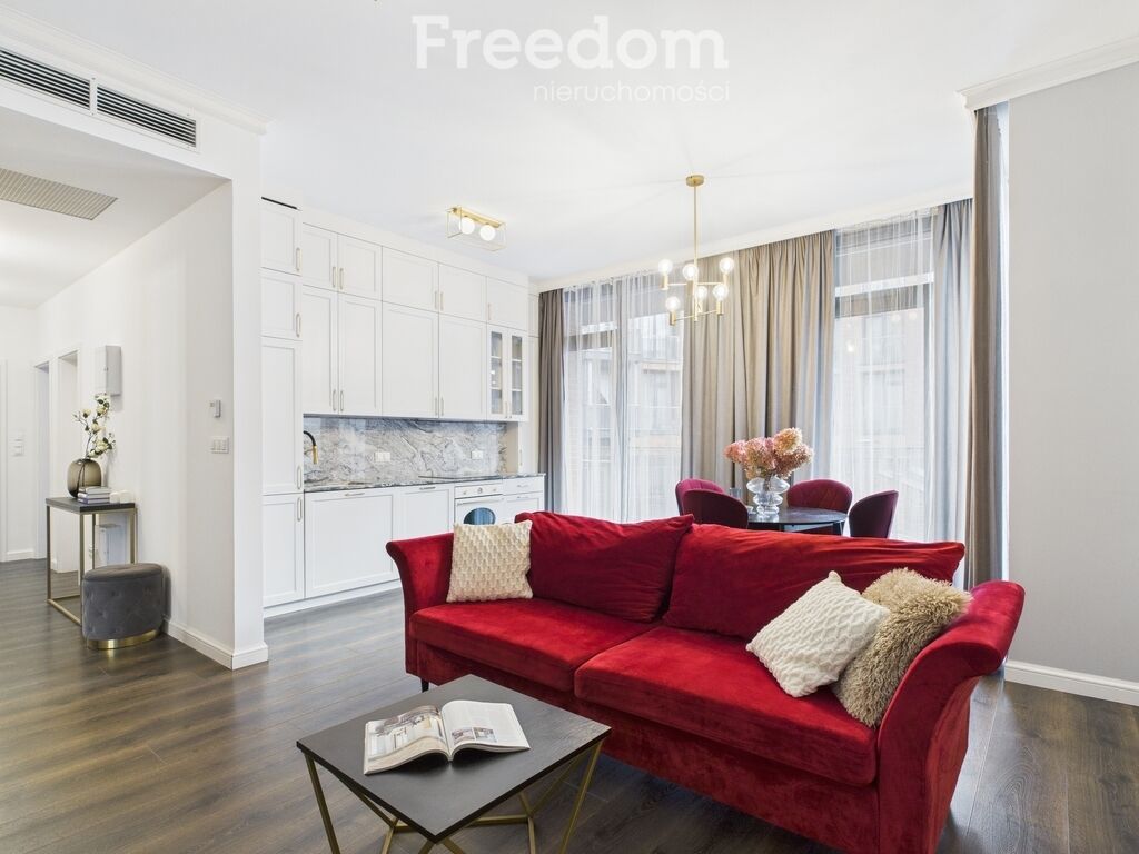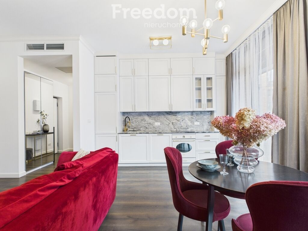 oraz welurowa, czerwona sofa. Kuchnia w pełnej zabudowie (lodówka,
