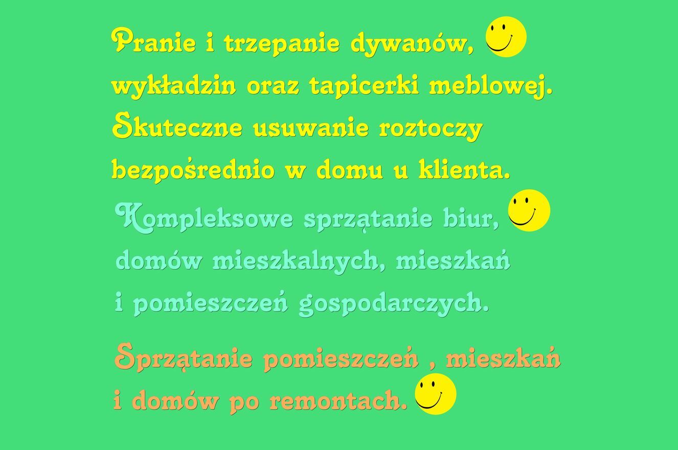 Oferujemy usługi w zakresie :- Pranie i trzepanie dywanów , wykładzin i tapicerki meblowej suchą pianą lub na mokro w zależności od zabrudzeń lub preferencji naszych klientów.