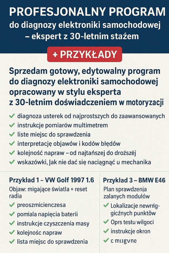 Program do analizy usterek.Program jest mojego autorstwa.Pomaga zaoszczędzić na nietrafionych diagnozach warsztatowych.Sprzedam gotowy, edytowalny program do diagnozy elektroniki samochodowej opracowany w stylu eksperta z 30-letnim doświadczeniem w motoryzacji.