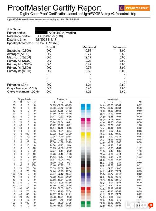 Witamy! Działamy od 2000 roku. Oferujemy kolorystyczne odbitki próbne proof cyfrowy do formatu A2+ z certyfikatem, certyfikacja Ugra Fogra według normy ISO12647. Ugra Fogra media wedge wersja V3.0.Druk 10-kolorowy Epson z atramentami pigmentowymi, odwzorowanie kolorów palety Pantone Solid Coated Colours do 99%. Rozdzielczość wydruków proof 720x1440 dpi.