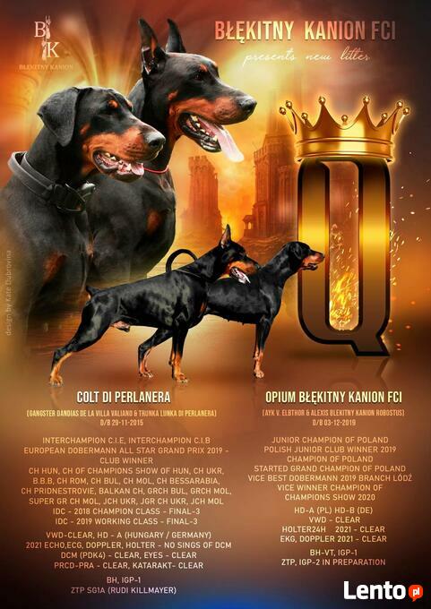 Kochamy psy ,a hodowla jest naszą pasją. Pary dobieramy tak, by odpowiednio dobrana pula genetyczna gwarantowała naszym szczeniętom doskonałe warunki już na starcie. Priorytetem dla nas jest uzyskanie szczeniąt zdrowych o wspaniałej psychice, doskonałych pod względem eksterieru i elitarnego rodowodu. W rodowodach rodziców Championy światowych ringów a nowe pokolenia Błękitny Kanion już osiągają wspaniałe sukcesy na ringach wystawowych w Polsce i na Świecie.Pragniemy poinformować iż w domowej hodowli dobermanów Błękitny Kanion FCI przyszły na świat śliczne szczenięta i są już gotowe do odbioru zapraszamy do kontaktu telefonicznego *** *** *** lub przez FB Aamon Akaal pomożemy w wyborze odpowiedniego szczeniaka mamy bardzo duże wieloletnie doświadczenie w rasie