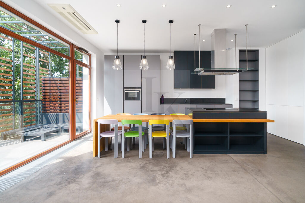 drewniane okna. Zabudowa meblowa z wyspą kuchenną oraz wysuwanym