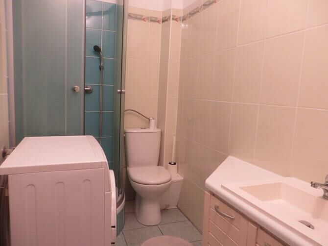 Łazienka: kabina prysznicowa, pralka, umywalka z szafką, WC.