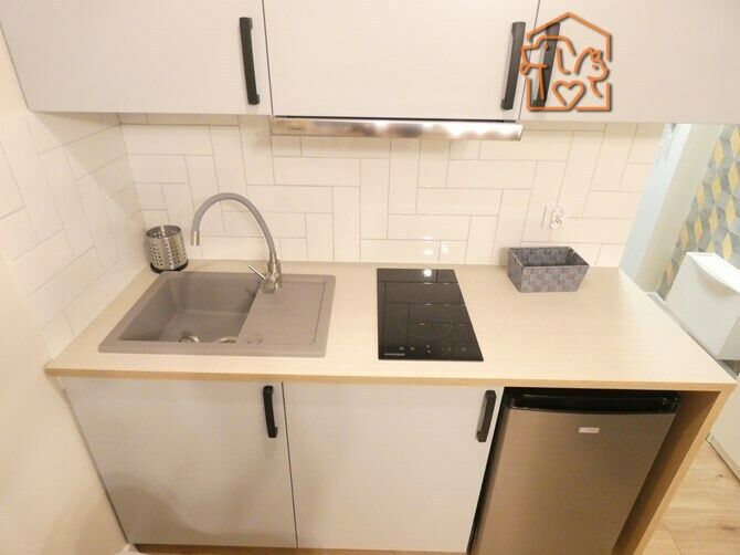 Kuchnia: lodówka, 2-palnikowa płyta indukcyjna, okap, zlew, szafki