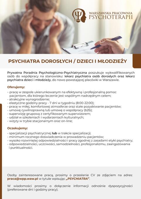 Osoby zainteresowane pracą, prosimy o przesłanie CV ze zdjęciem na adres: praca(malpa)wpp.waw.pl w tytule wpisując „PSYCHIATRA”.