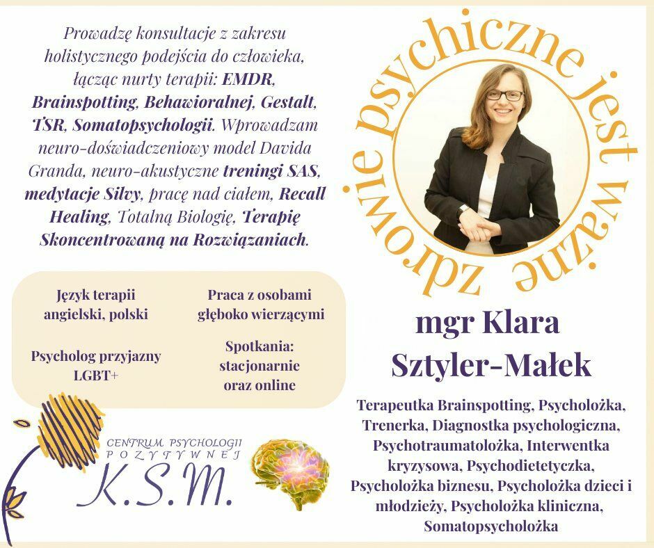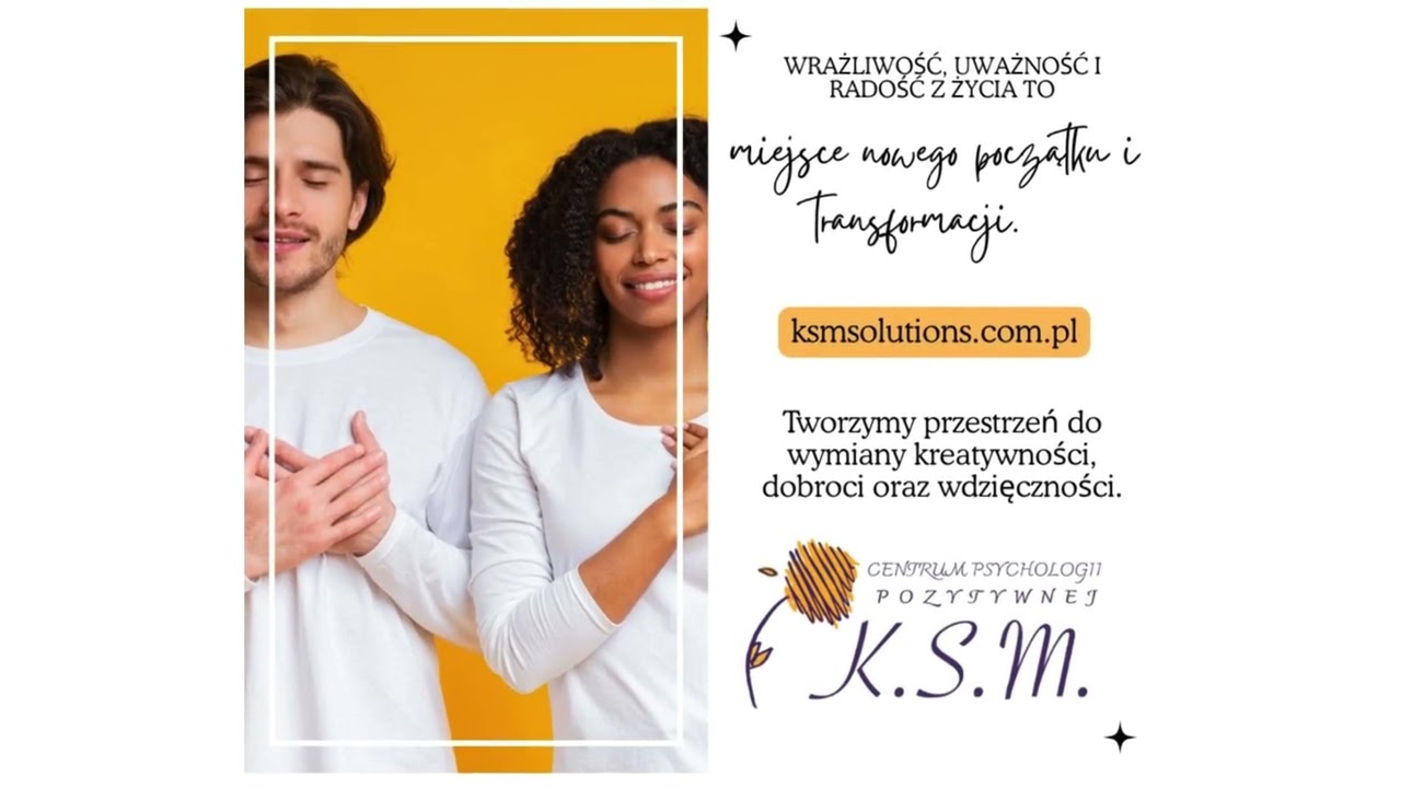 Centrum Psychologii Pozytywnej KSM to miejsce, w którym troska o dobrostan psychiczny spotyka się z pasją do rozwoju osobistego. Tworzymy przestrzeń pełną zrozumienia, empatii i inspiracji – dla każdego, kto chce zadbać o siebie, swoje emocje i relacje.Wierzymy, że każdy człowiek ma w sobie zasoby, które warto odkrywać i wzmacniać. Dlatego oferujemy: