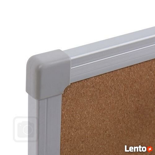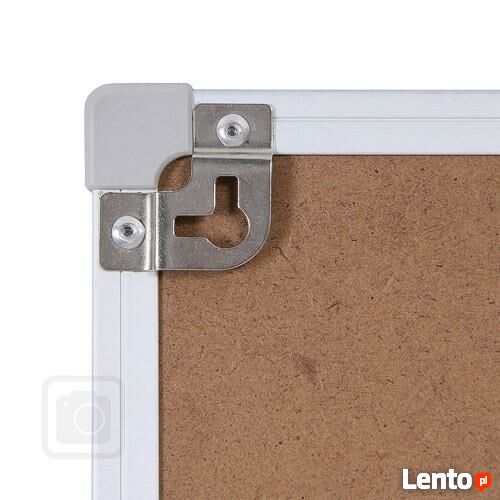 Tablica korkowa oprawiona w ramie aluminiowej, narożniki zaokrąglone, uchwyty do wieszania ramy w pionie lub poziomie.