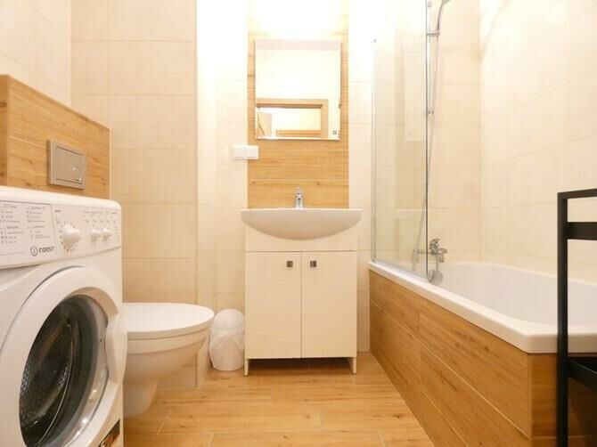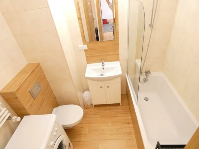 Łazienka: wanna, pralka, szafka, umywalka, sedes.