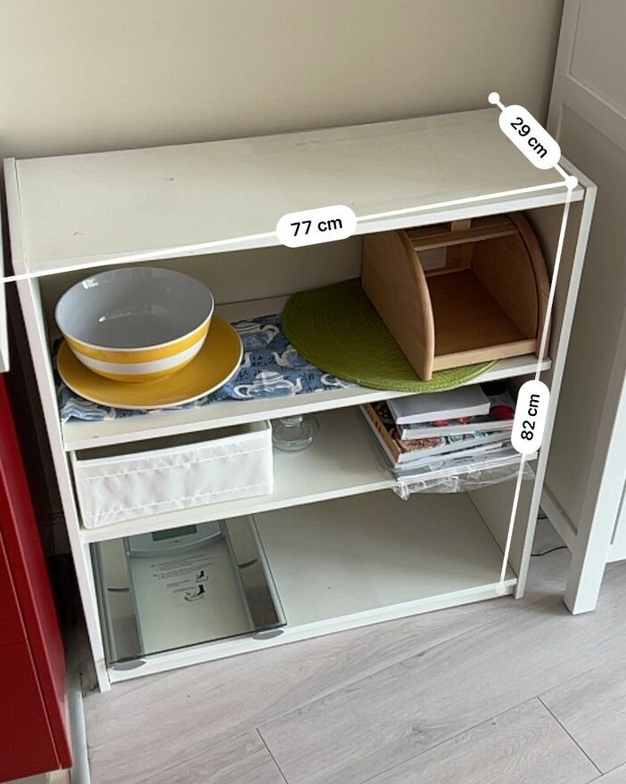 Biały metalowy regał z czterema otwartymi półkami, wymiary 77×29×82 cm. Prosta, lekka konstrukcja na metalowej ramie.Stan używany — ślady użytkowania na półkach i blacie. Konstrukcja stabilna, nic się nie chwieje.