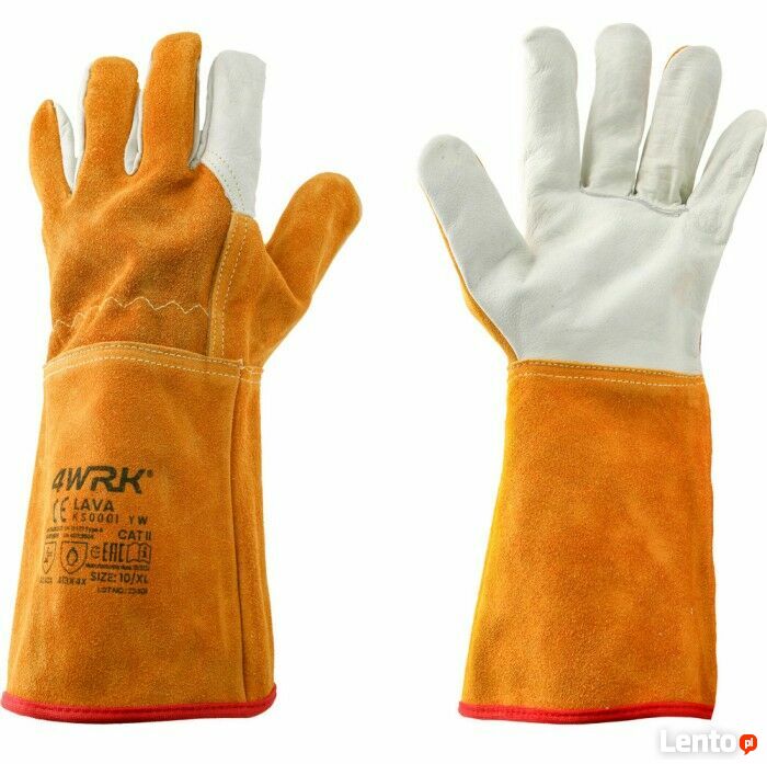 Mankiet rękawicy został wykonany z wytrzymałej dwoiny bydlęcej w kolorze żółtym, co nie tylko zapewnia dodatkową ochronę dla nadgarstka, ale także czyni rękawicę widoczną nawet w trudnych warunkach oświetleniowych, co zwiększa bezpieczeństwo użytkownika. Rękawica LAVA spełnia najwyższe standardy bezpieczeństwa, zgodnie z normami EN 21420:2020, EN 388:2016 oraz EN 12477 Typ A, co potwierdza jej doskonałą odporność na ścieranie, przetarcia, uderzenia oraz przecięcia. Dodatkowo, spełnia również wymagania normy EN 407:2004, oznaczającą jej odporność na ciepło i płomienie. Oznaczenie (4,1,2,X,4,X) świadczy o jej wysokiej trwałości i skuteczności w różnych sytuacjach spawalniczych.