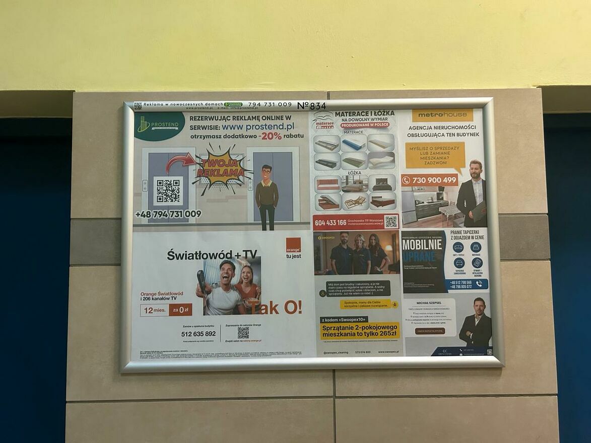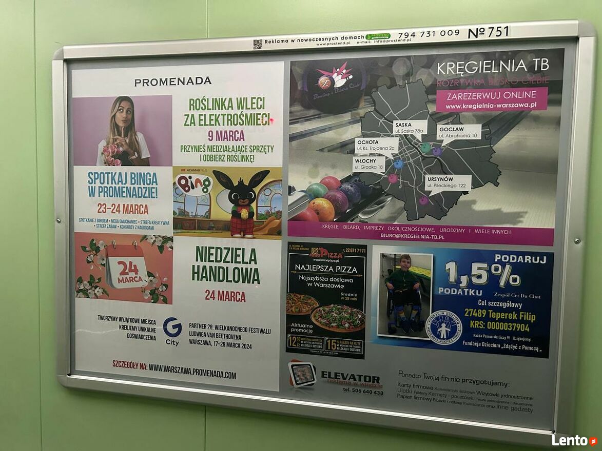Oferujemy skuteczną reklamę w windach i przy windach w blokach mieszkalnych na terenie Warszawy.Idealne rozwiązanie dla lokalnych firm, które chcą dotrzeć do mieszkańców konkretnych dzielnic.