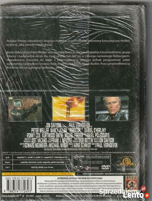 Robocop (The Best of Science Fiction II) [DVD]+[Książka] RoboCop Seria: The Best of Science Fiction II Kraj: USA Rok produkcji: 1987 Reżyseria: Paul Verhoeven Scenariusz: Edward Neumeier, Michael Miner Muzyka: Basil Poledouris Obsada: Ray Wise, Bill Farmer, Allan Graf, Bill Blair, Kurtwood Smith, Miguel Ferrer, Michael Gregory, Ronny Cox, Peter Weller, Del Zamora, Dan O'Herlihy, Edward Edwards, Jesse D. Goins, Katie Griffin, Lee de Broux, Robert DoQui, Diane Robin, Mike Moroff, Tyrees Allen, ... Studio: MGM Opis Tom 14: DVD + Książka Niedaleka przyszłość. Detroit. Podczas akcji policyjnej ginie jeden z oficerów. W tajnym laboratorium lekarze przywracają go do życia i łączą niektóre elementy jego ciała oraz mózg z metalowym pancerzem. Tak powstaje mechaniczny glina, postrach przestępców w Detroit, który zrobi wszystko, żeby zabić swoich morderców. Stan produktu Produkt ORYGINALNY. Płyta NOWA. Tytuł: Robocop (The Best of Science Fiction II) Dział: DVD, KSIĄŻKA Nominacje do Oscara: 2 Kategoria wiekowa (MPAA): PG-13 Czas trwania: 99 min. Dodatki: bezpośredni dostęp do scen Komentarze audio Napisy: polskie, angielskie, czeskie, słoweńskie, tureckie, węgierskie Dźwięk: Dolby Digital 5.1 polski Dolby Digital 5.1 angielski Dolby Digital 5.1 czeski Dolby Digital 5.1 węgierski Polska wersja: lektor, napisy Obraz: 16:9 / 1,85:1 Region DVD: 2 Opakowanie: booklet Liczba nośników: [1xDVD] + [1xKSIĄŻKA] Karton 83 Ogłoszenie jest aktualne dopóki znajduje się na stronie . Odbiór osobisty lub wysyłkaSprawdź zainteresowanie tym ogłoszeniem