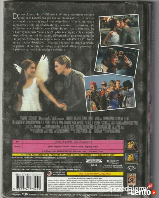 Obsada: John Leguizamo, Paul Sorvino, Leonardo DiCaprio, Brian Dennehy, M. Emmet Walsh, Claire Danes, Paul Rudd, Jesse Bradford, Pete Postlethwaite, Miriam Margolyes, Harold Perrineau, Dash Mihok, Diane Venora, Vondie Curtis-Hall, Christina Pickles Reżyseria: Baz Luhrmann Dźwięk: polski, angielski i inne Napisy: polski, angielski i inne Czas trwania: ok.115 min Opakowanie: książkowe ORYGINAŁ, NOWY, ZAFOLIOWANY OPIS : Dramat "Romeo i Julia" Williama Szekspira przeniesiony na ekran przez Baza Luhrmanna jest bez wątpienia najbardziej niekonwencjonalną adaptacją tego klasycznego dzieła. W role tytułowych kochanków wcielili się młodzi aktorzy - Leonardo DiCaprio i Claire Danes. Akcja rozgrywa się w fikcyjnym mieście Verona Beach, gdzie ścierają się wpływy najróżniejszych kultur od klasycznej, elżbietańskiej, po postmodernizm i futuryzm. Niezwykła scenografia (nominacja do Oscara), fascynująca ścieżka dźwiękowa i wspaniałe kreacje aktorskie sprawiły, że powstał obraz intrygujący i błyskotliwy, pozostający w pamięci - kultowy film młodego pokolenia. Karton 77Sprawdź zainteresowanie tym ogłoszeniem