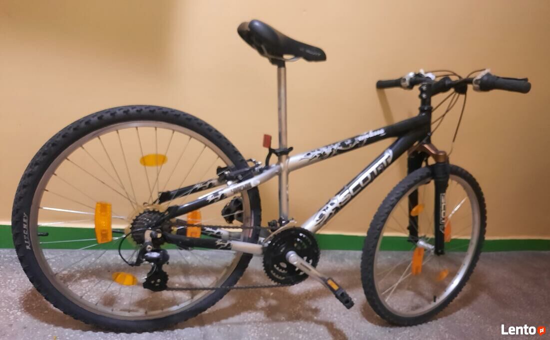 Witam serdecznie,Sprzedam rower Scott . Koła 24. Rama aluminiowa pod siodłem 27 cm / 10 cali. Przerzutki Shimano SiS 7x3. Amortyzator SrSuntoure. Rower po serwisie gotowy do sezonu. Stan wizualny dobry , normalne ślłady użytkowania.. Zapraszam