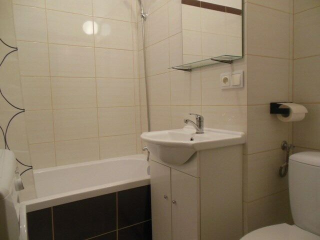 Łazienka: wanna, WC, pralka oraz umywalka z szafką.