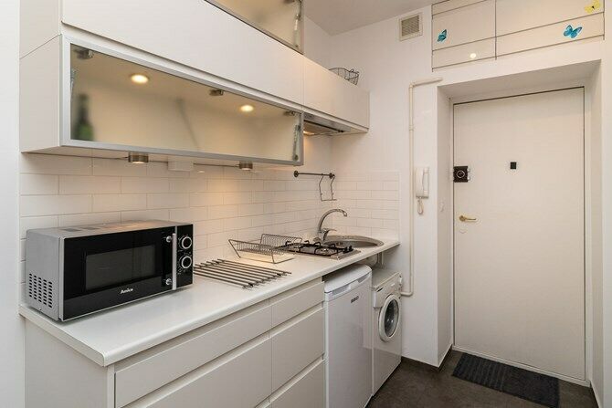 Aneks kuchenny: pralka, podblatowa lodówko-zamrażarka, kuchenka