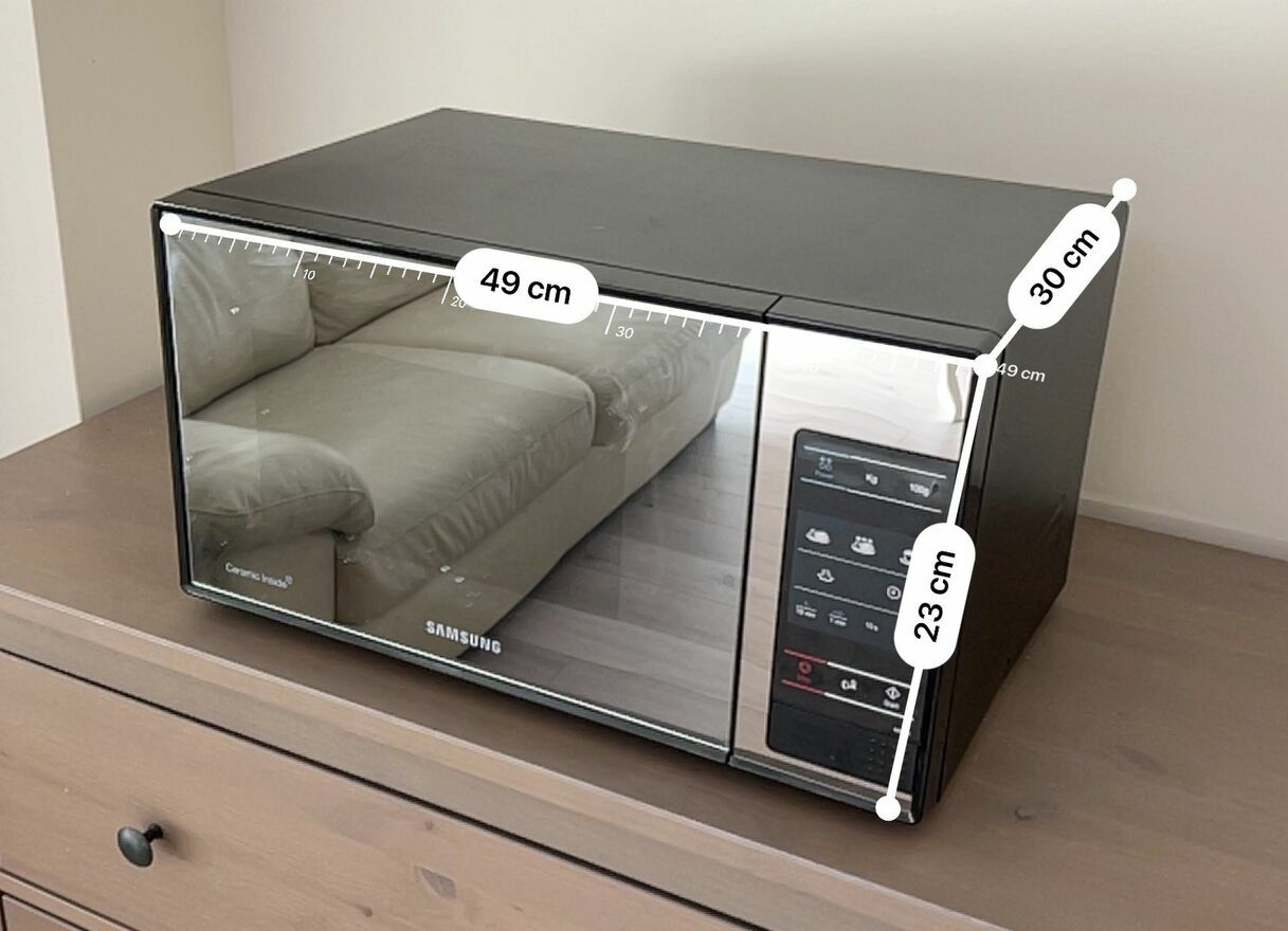 Kuchenka mikrofalowa Samsung ME83X/XEO, pojemność 23 litry, moc 800W. Model z lustrzanym frontem i dotykowym panelem sterowania.Wnętrze z powłoką Ceramic Inside, która ułatwia czyszczenie i jest bardziej odporna na zarysowania niż tradycyjna emalia. Talerz obrotowy na miejscu, drzwiczki zamykają się prawidłowo, panel dotykowy działa bez zarzutu — wszystkie przyciski reagują.