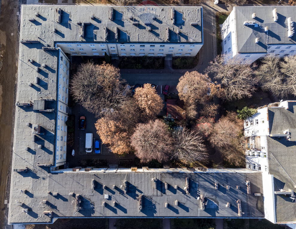 Wewnątrz podwórza, za szlabanem, znajdują się miejsca postojowe