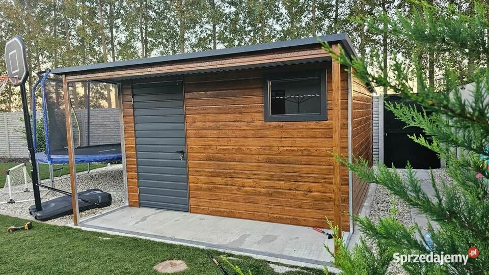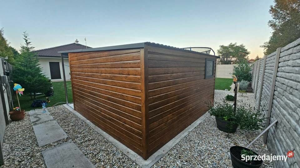 Schowek ogrodowy o wymiarach 4 m x 4 m w kolorystyce orzech wyposażony dodatkowo w wiatę drzwi i okna w kolorze antracyt.Konstrukcja w całości wykonana z profilu zamkniętego ocynkowanego 30x30.