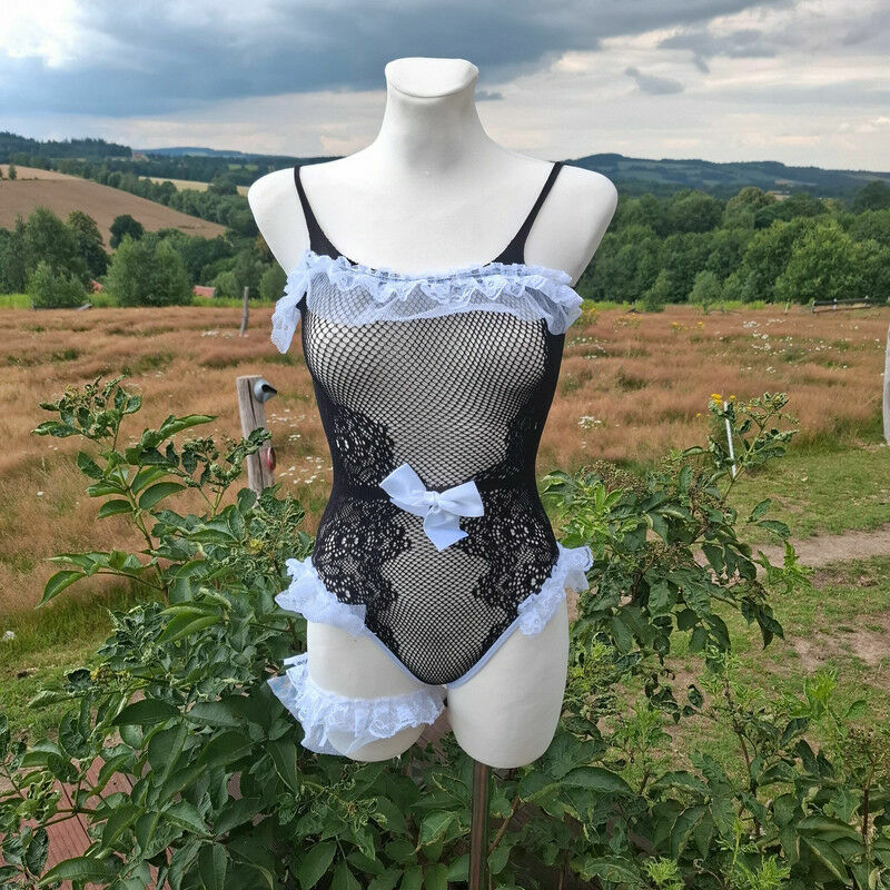 Zmysłowe body erotyczne – czarne, siateczkowe z delikatną białą koronką i uroczymi kokardkami. Podkreśla kobiecą sylwetkę, dodaje pewności siebie i pobudza wyobraźnięWYSYŁKA OLX, VINTED LUB INACZEJ