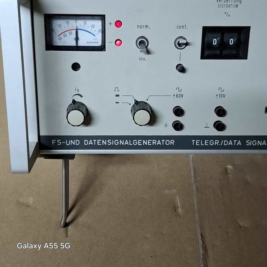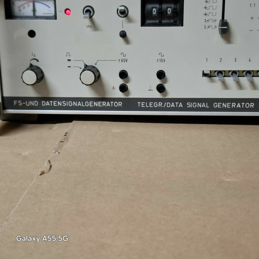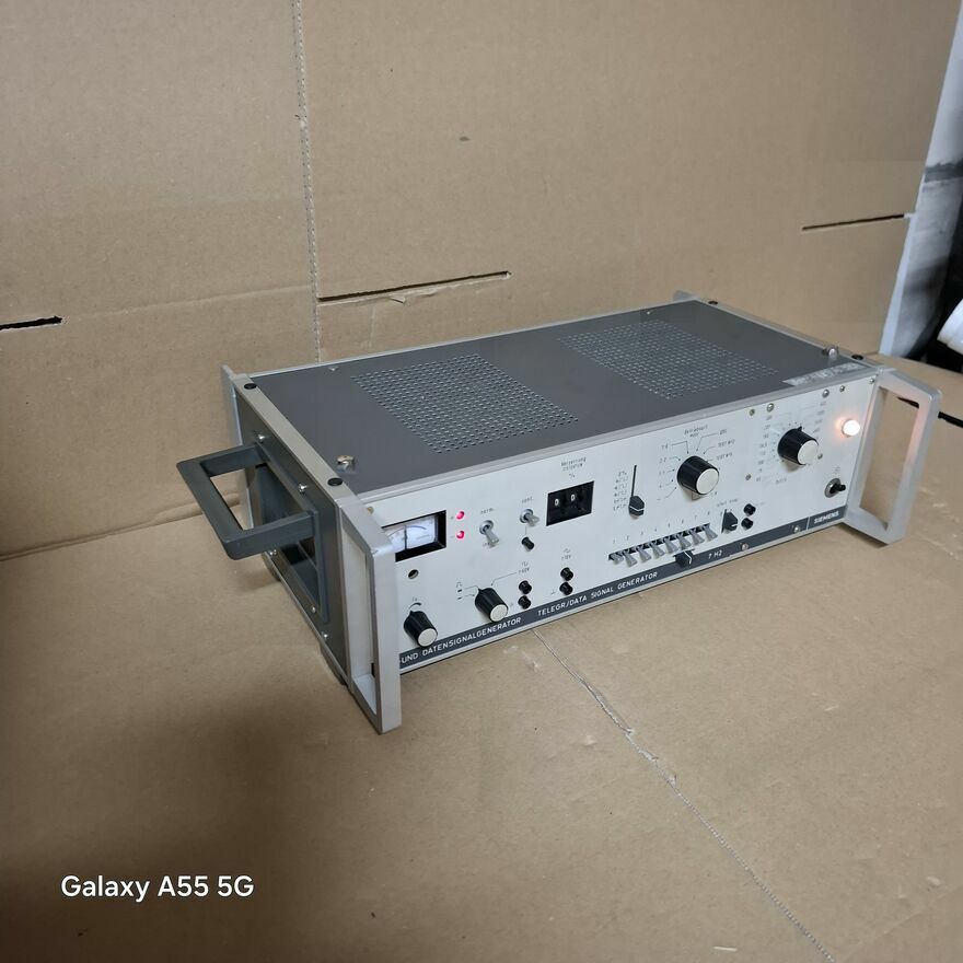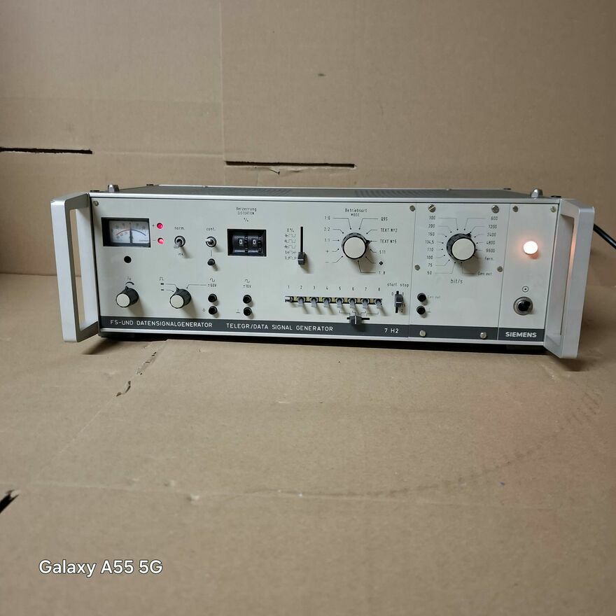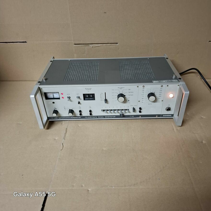 Urządzenie to generator sygnału telegraficznego i danych, model Siemens 7 H2 FS-UND DATENSIGNALGENERATOR.Jest to sprzęt telekomunikacyjny, który służy do generowania sygnałów w systemach telegraficznych i transmisji danych. Nazwa "FS-UND DATENSIGNALGENERATOR" to skrót od niemieckiego "Frequenz-Shift-Keying und Datensignalgenerator", co oznacza "generator sygnału z kluczowaniem z przesunięciem częstotliwości i sygnału danych".gratka dla kolekcjonera.