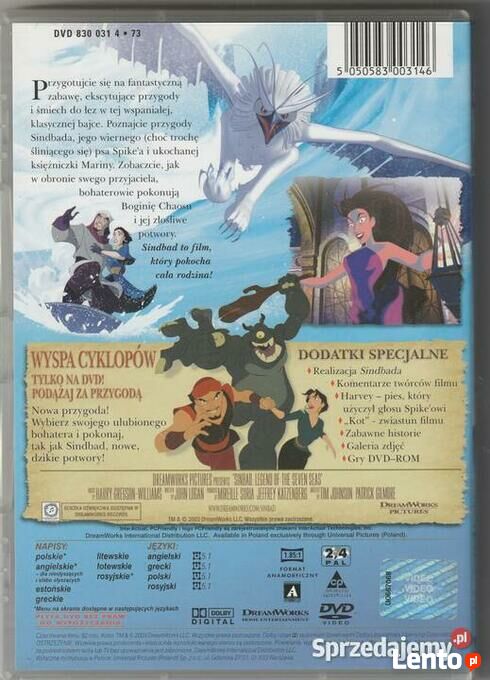 SINDBAD LEGENDA SIEDMIU MÓRZ [ DVD ] Dźwięk: polski dubbing Napisy: polskie Czas: 82 min. DODATKI SPECJALNE Realizacja Sindbada DREAMWORKS PICTURES PRESENTS "SINBAD: LEGEND OF THE SEVEN SEAS Komentarze twórców filmu Harvey – pies, który użyczył głosu Spike'owi ,,Kot" - zwiastun filmu Zabawne historie Galeria zdjęć Gry DVD-ROM Sindbad, najzuchwalszy i najbardziej znany łotr, który pływał po siedmiu morzach, całe swe życie prosił o kłopoty i w końcu doczekał się odpowiedzi w wielkim stylu. Stając się osią intrygi mającej na celu kradzież bezcennego i obdarzonego największą mocą skarbu - Księgi Pokoju - Sindbad ma jedyną szansę na odnalezienie i zwrot cennej księgi, w przeciwnym razie jego najlepszy przyjaciel, Proteusz, umrze. Sindbad decyduje się nie podejmować szansy i zamiast tego obrać kurs na wyspy Fidżi. Karton 92 Ogłoszenie jest aktualne dopóki znajduje się na stronie . Odbiór osobisty lub wysyłkaSprawdź zainteresowanie tym ogłoszeniem