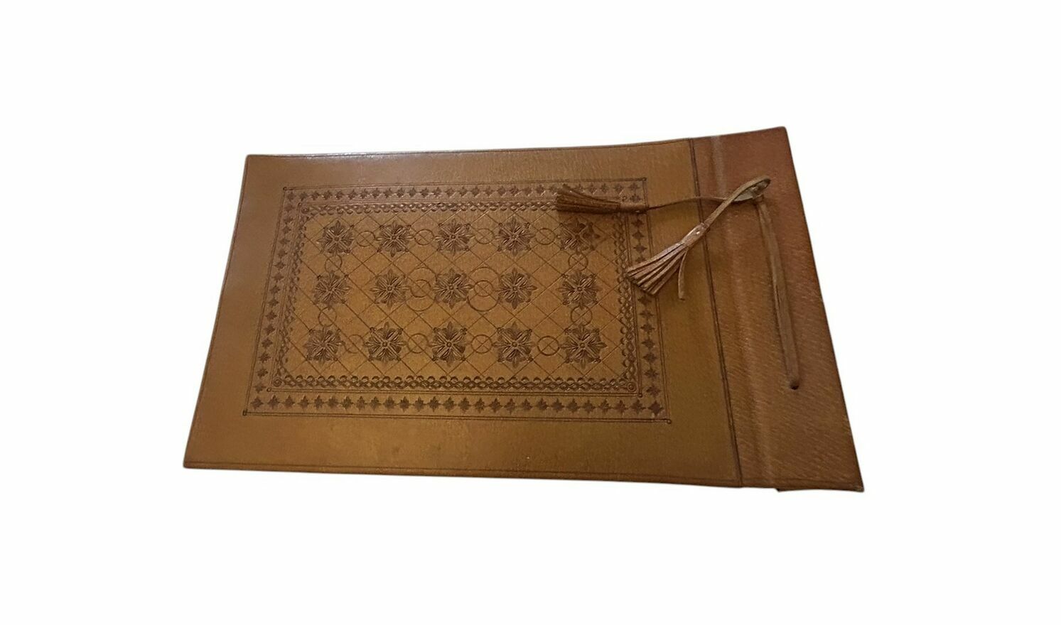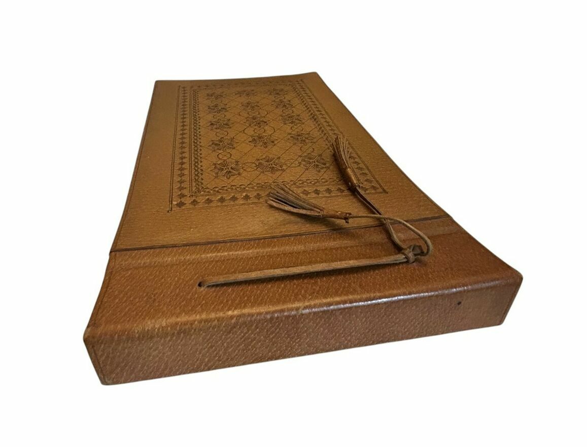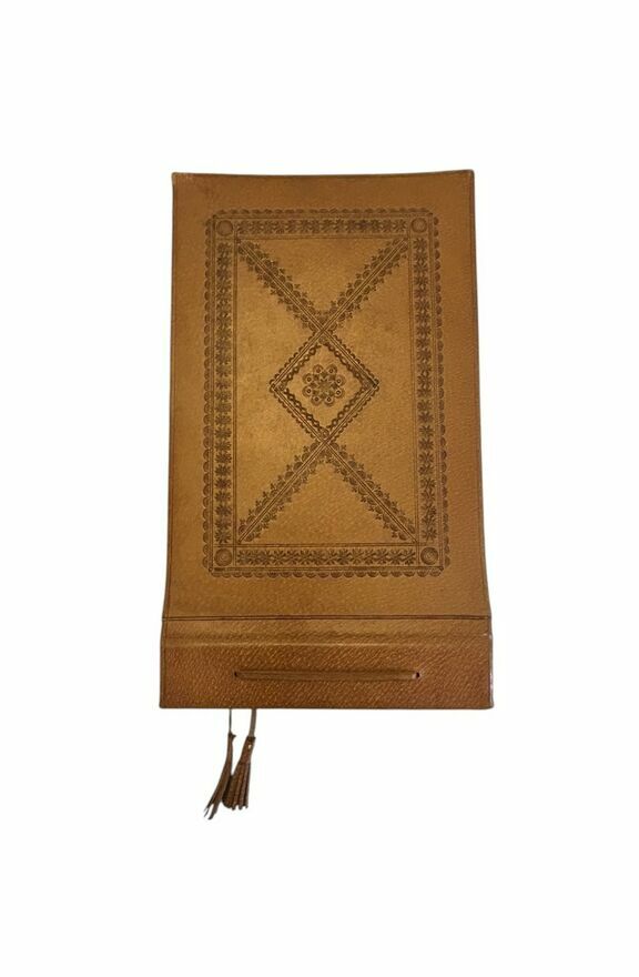 Oprawa skórzana, grzbiet przewiązany rzemieniem z ozdobnymi frędzlami.