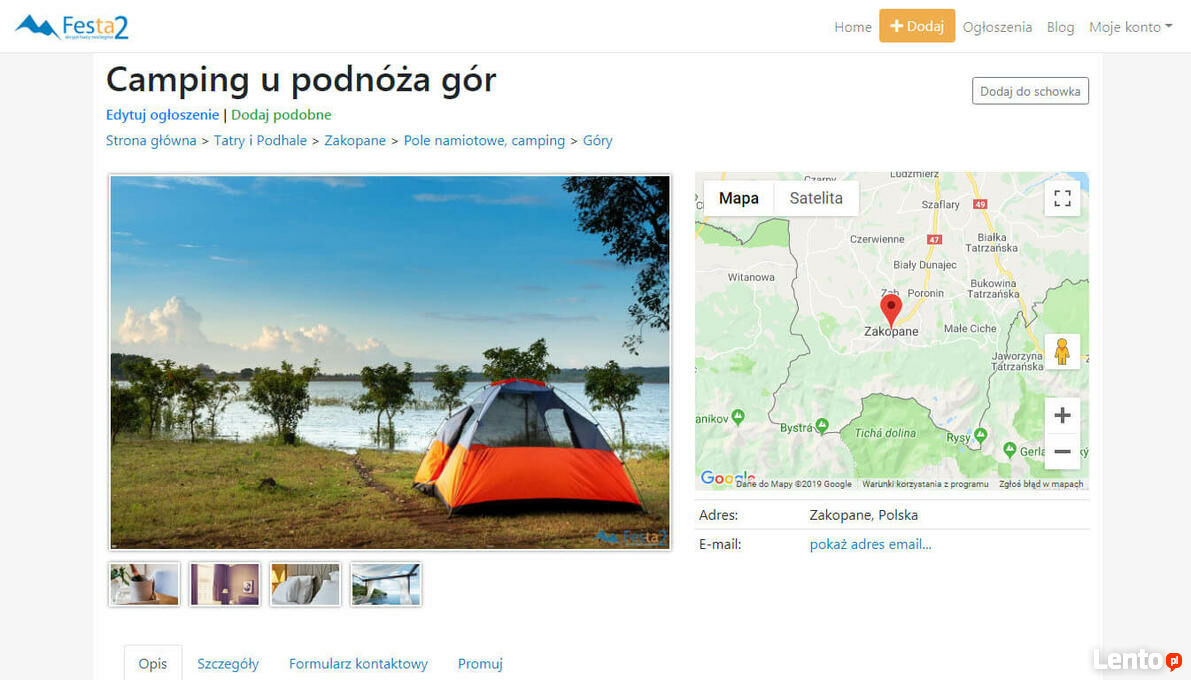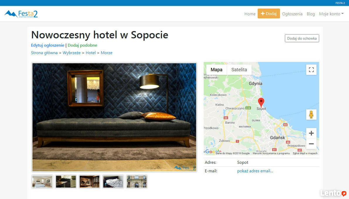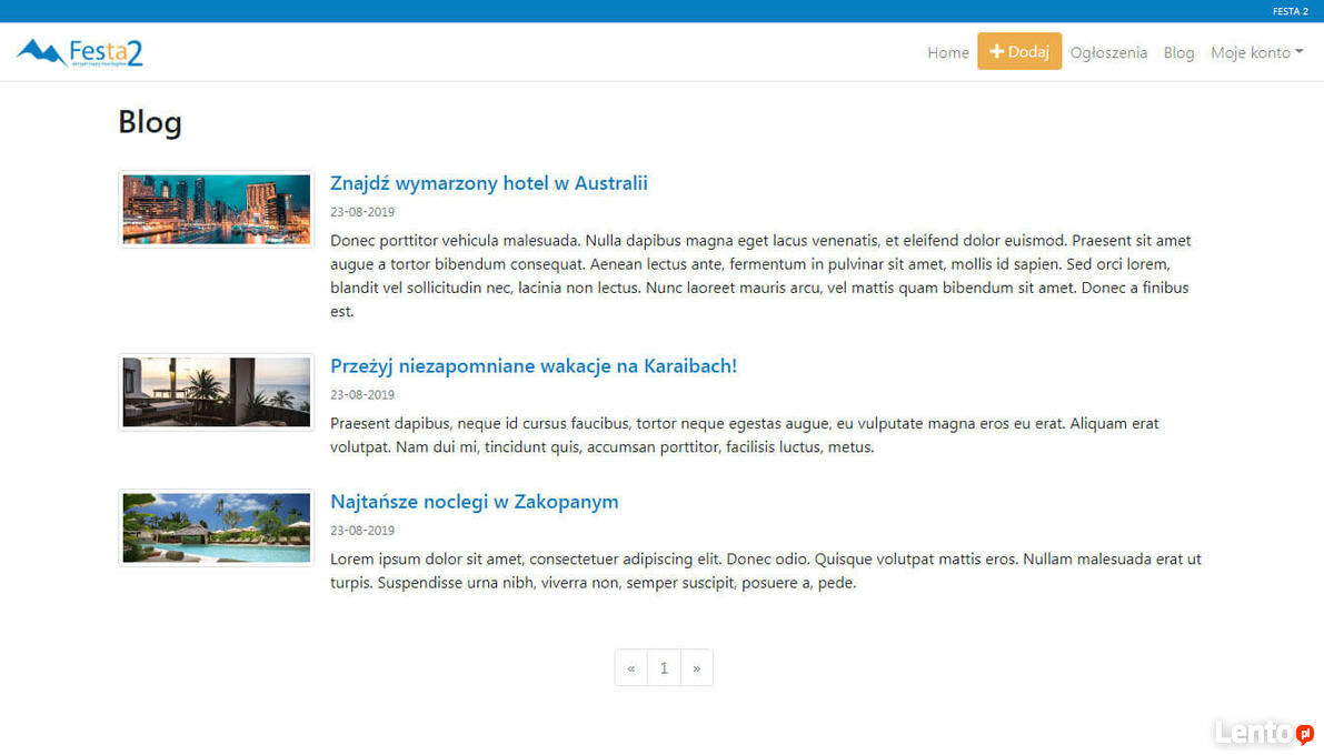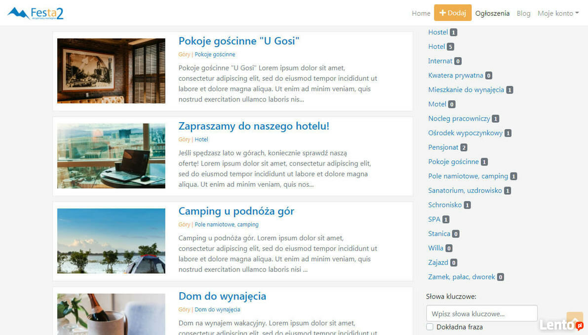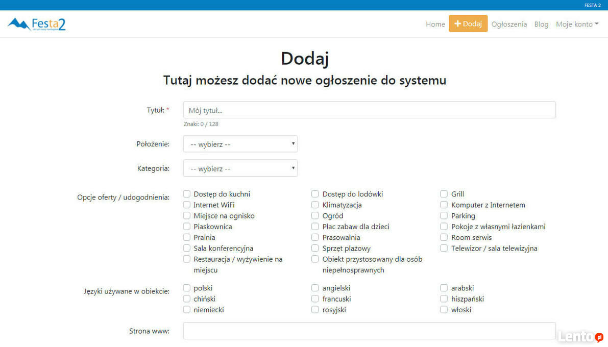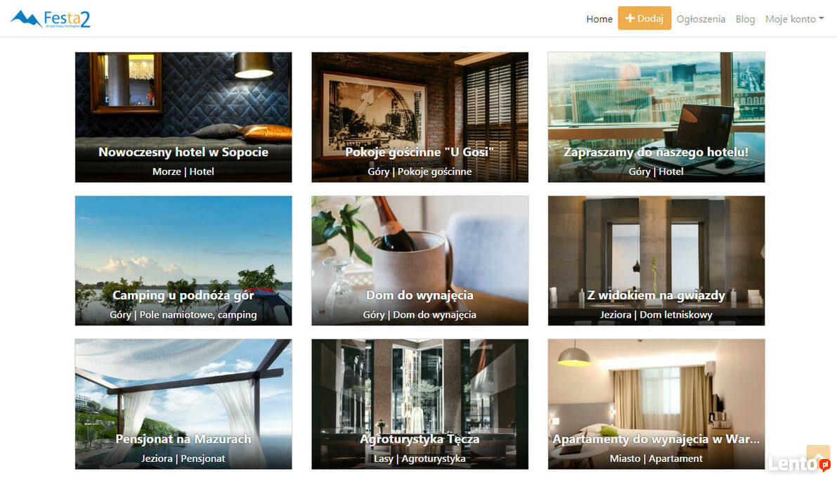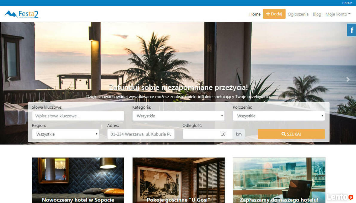 Skrypt Festa2 umożliwia stworzenie strony www z bazą noclegów (bazą miejsc noclegowych). Wyróżnia się wyjątkową intuicyjną obsługą z bardzo rozbudowaną funkcjonalnością. Umożliwia stworzenie portalu lokalnego, ogólnopolskiego lub międzynarodowego. System doskonale nadaje się do prowadzenia małych oraz wielkich stron ze spisem miejsc noclegowych typu: hotele, hostele, agroturystyka, domy letniskowe, internaty, motele, noclegi pracownicze, domy wczasowe, domy do wynajęcia, wille, zajazdy, zamki itd.Możesz zarabiać na portalu poprzez wprowadzenie opłat za dodanie albo promowanie ogłoszenia. Poza tym, możesz zarabiać poprzez umieszczenie na portalu reklam z programów partnerskich, z Google AdSense lub prywatnych zleceń.