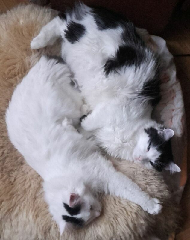 Chmurka i Funio to rodzeństwo kotów z dłuższym futerkiem. Mają 11 miesięcy, Chmurka to dziewczynka z białym płaszczykiem i czarnym ogonkiem, braciszek ma więcej czarnych wzorków. Ich sierść nie wymaga specjalnej pielęgnacji, wystarczy szczotkowanie jak u innych kotów.Kociaki były wyrzucone na działkę, zaniedbane trafiły do lecznicy i domu tymczasowego. Dziś są już zdrowe, zadbane, wykastrowane i zaszczepione.