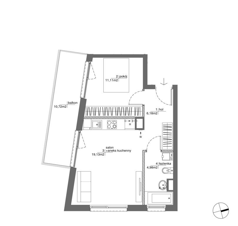 salonu z aneksem (19,13 m²) pokoju (11,11 m²) łazienki (4,98