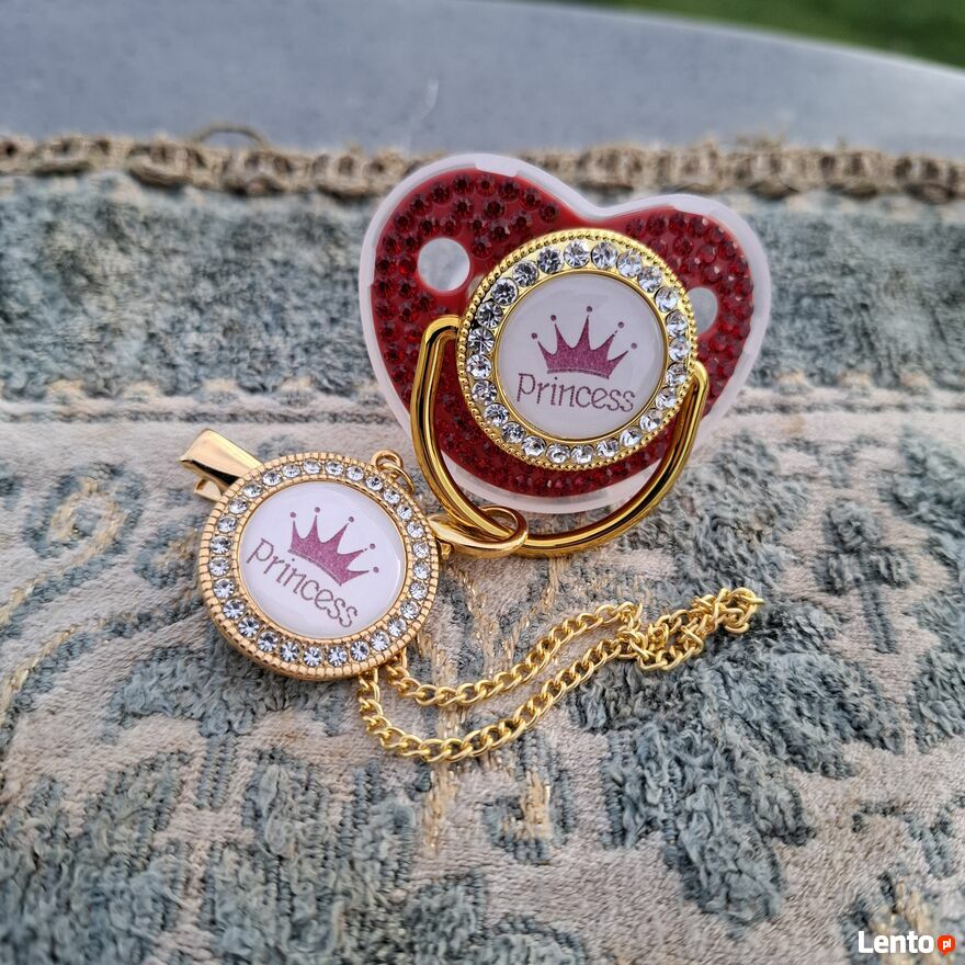 Zjawiskowy smoczek w kolorze czerwonym, złotym i białym, ozdobiony koroną, cyrkoniami i delikatnym napisem „Princess”. Zestaw zawiera dopasowany złoty klips z łańcuszkiem, który nadaje królewski styl i zapobiega zgubieniu.️ Stan: nowy, bez metki ️ Kolor: czerwony + złoto + biały ️ Materiał ustnika: silikon, BPA free ️ Wiek dziecka: 0–12 miesięcy ten jest droższy bo był drogi